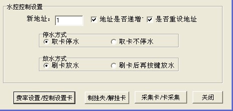 2 水控控制設置:新地址設置為1,把地址號是否遞增和是否重設機器號前面的選項選上,如下圖所示,點擊費率設置|控制設置卡按鈕,點擊控制設置卡, 即可成功制作成控制設置卡去修改聯網型水控一體機的機器號。控制設置卡在機器上數卡成功時會提示8 OK 9 OK 10 OK